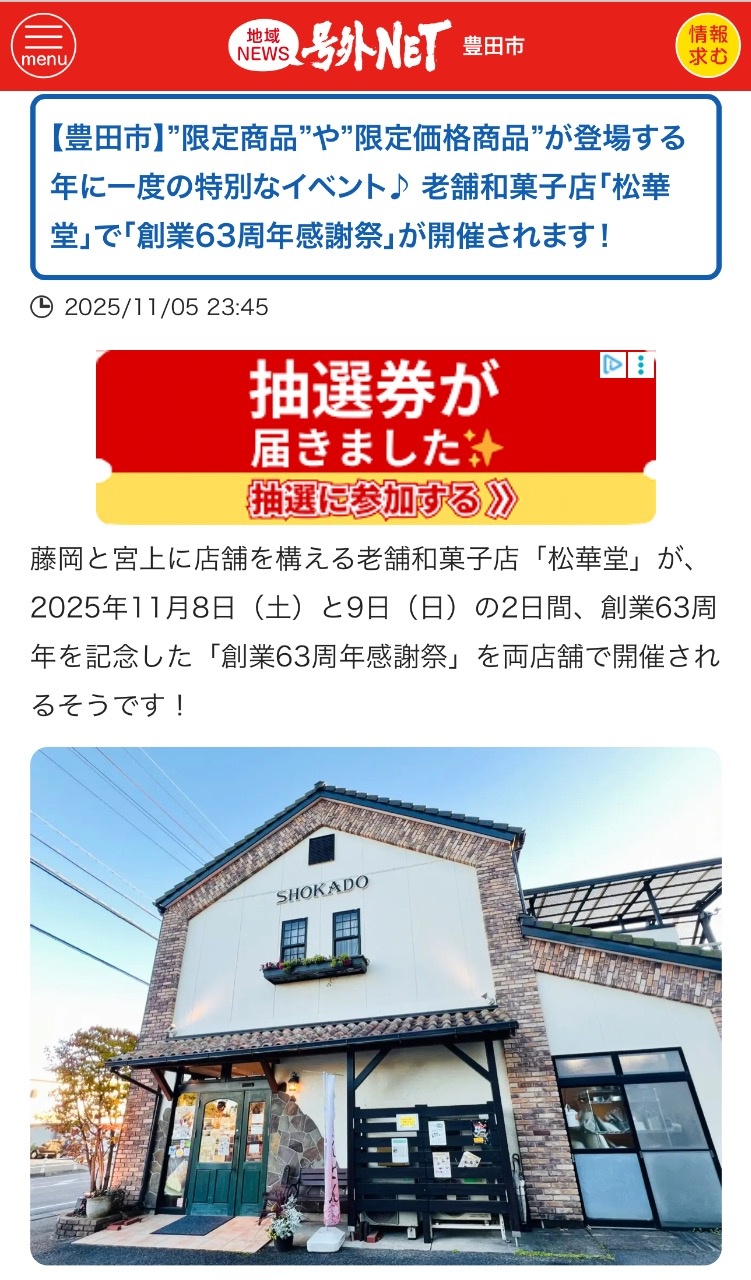 2025年11月07日(金) お知らせ NEW 11月8日(土)、9日(日)の感謝祭について号外ネット豊田市さんが紹介してくれました 号外ネットさんが紹介してくださいました https://share.google/j9C2Z4MXXjmr6r1mA